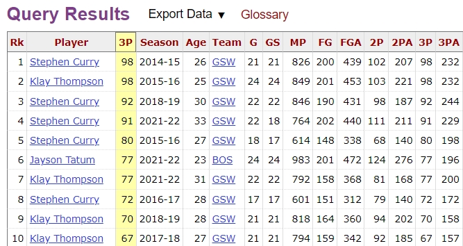 The total number of three points in the NBA playoff in a single year history is 98 points maintained by Curry and clay (The following figure shows the top 10 of the list of three points in the NBA playoff in a single year history).