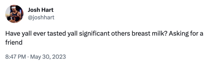 Hart: Have you ever tasted your partner’s breast milk? I asked a friend for me.