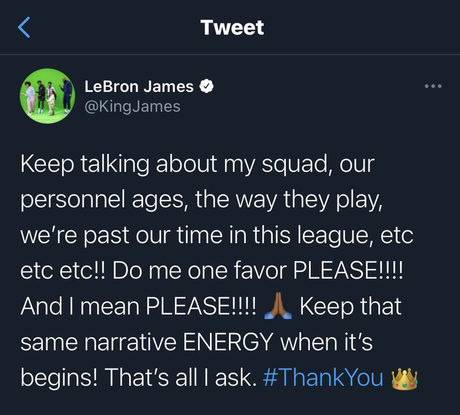 James: “continue to discuss our team, discuss our age, discuss whose way of playing, who is often injured, we have already been angry in this league, etc. Do me a favor, I mean please, when the season starts, please continue to discuss, this is all my requirements, thank you.”